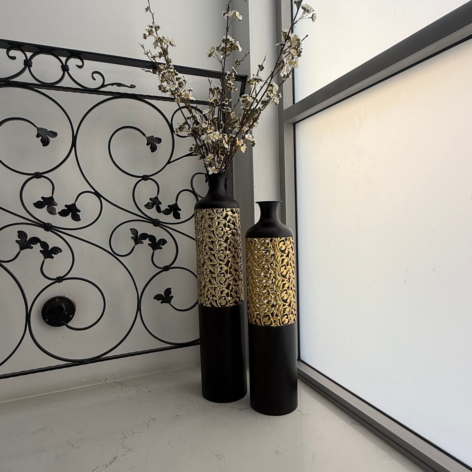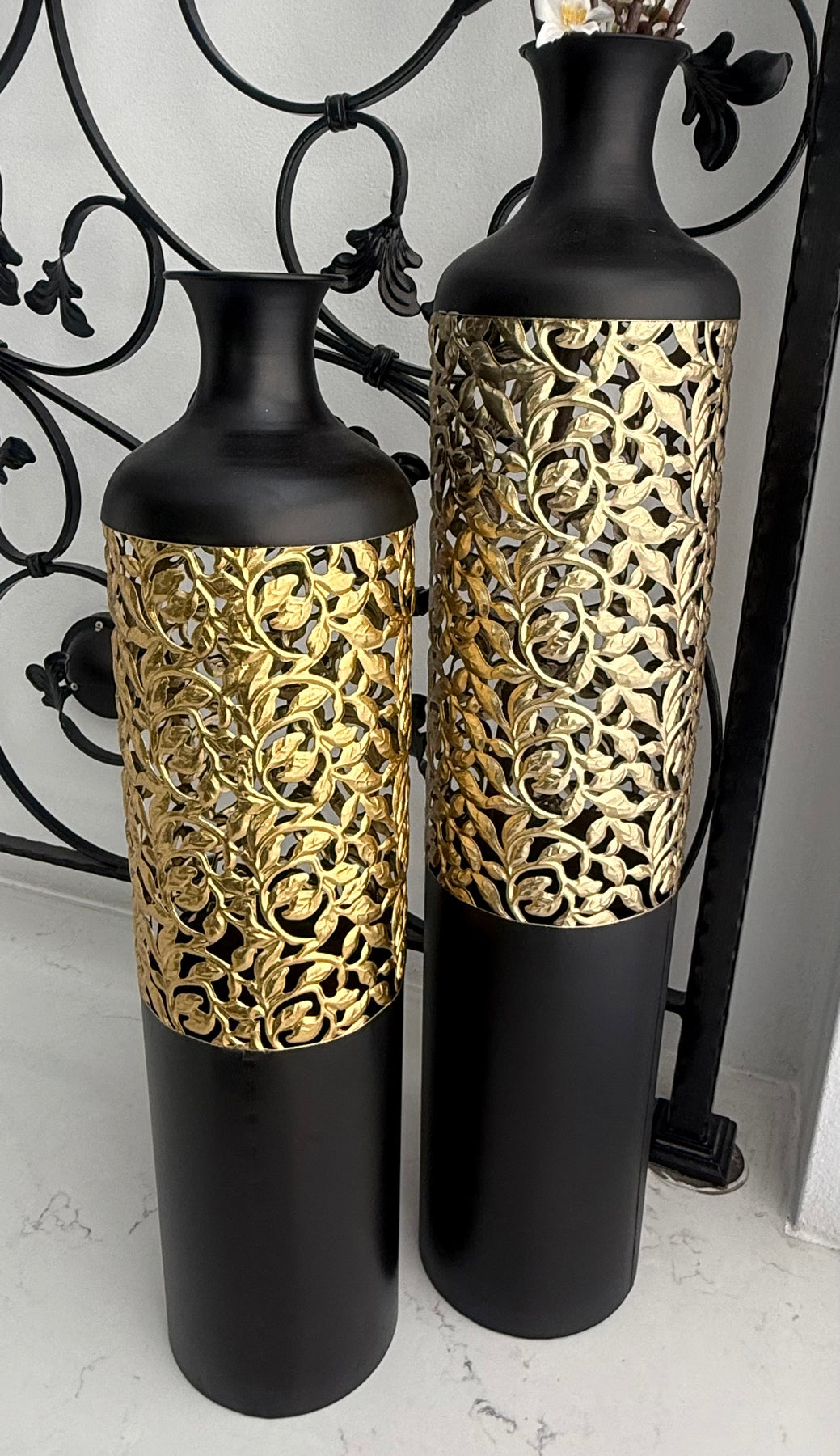 The black Gold Metal Floor Vase offers endless possibilities. Fill it with towering branches for a dramatic effect, fresh flowers for a pop of color, or simply leave it empty as a striking standalone piece.