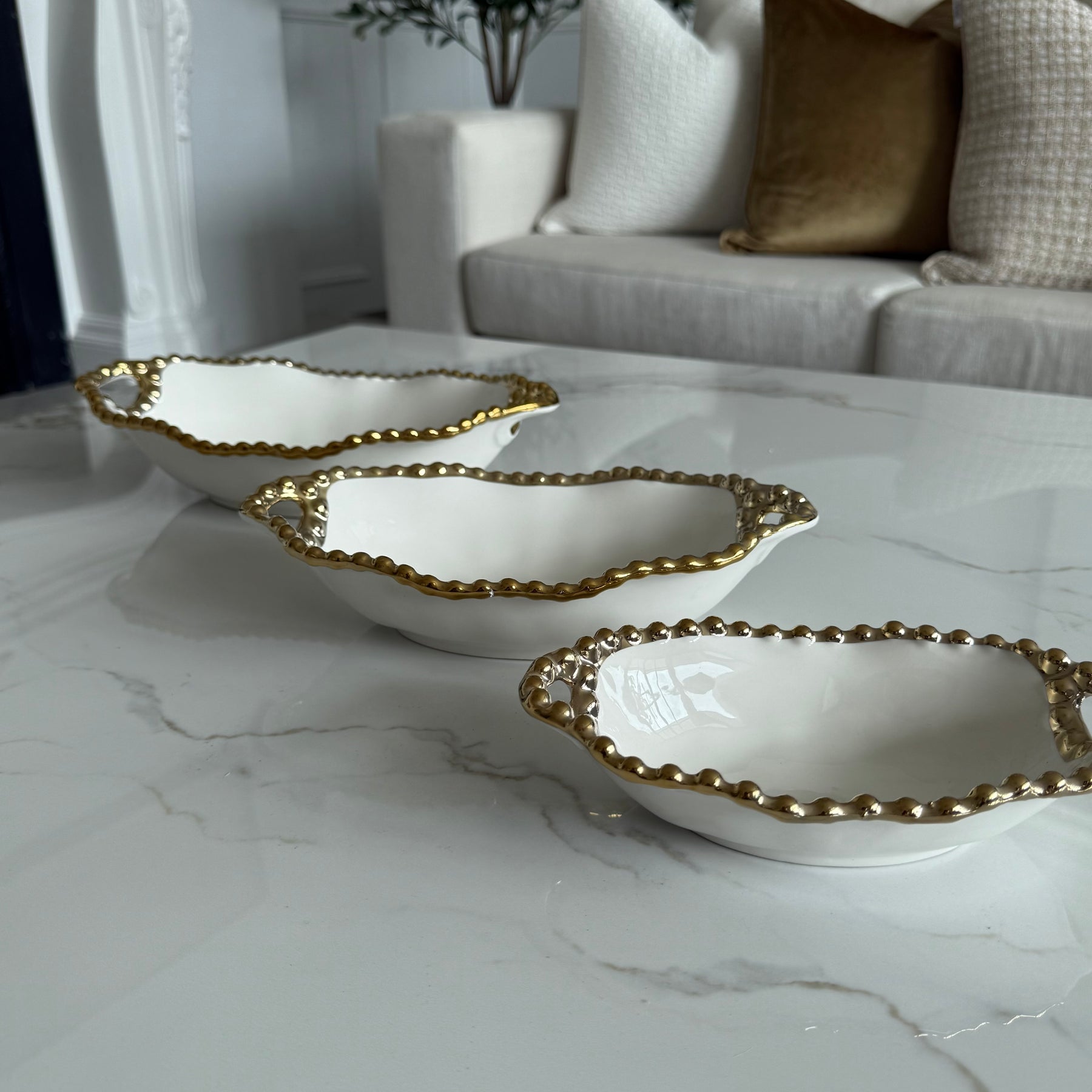 Gilded Pearl Oval Handled Serving Bowl