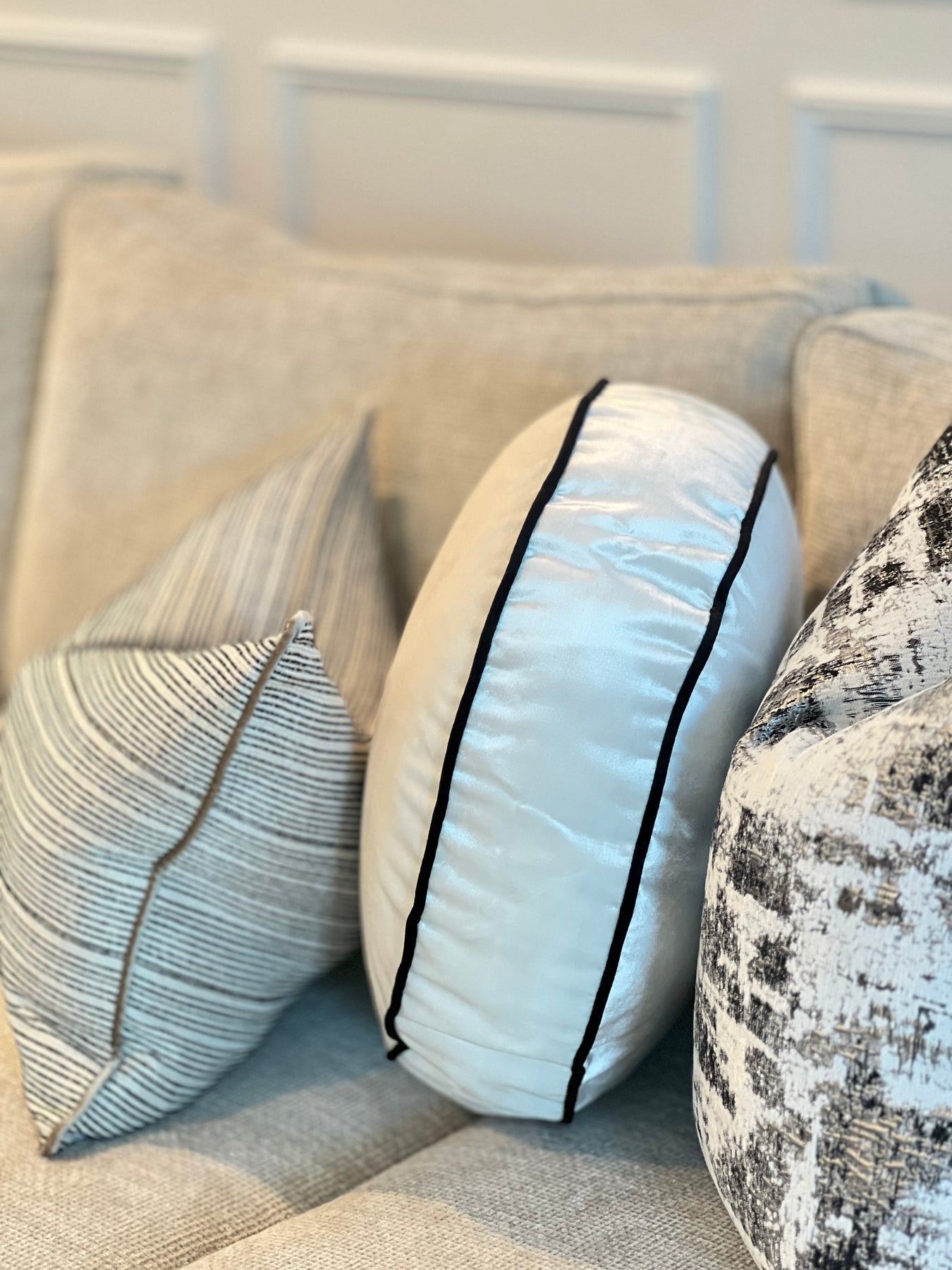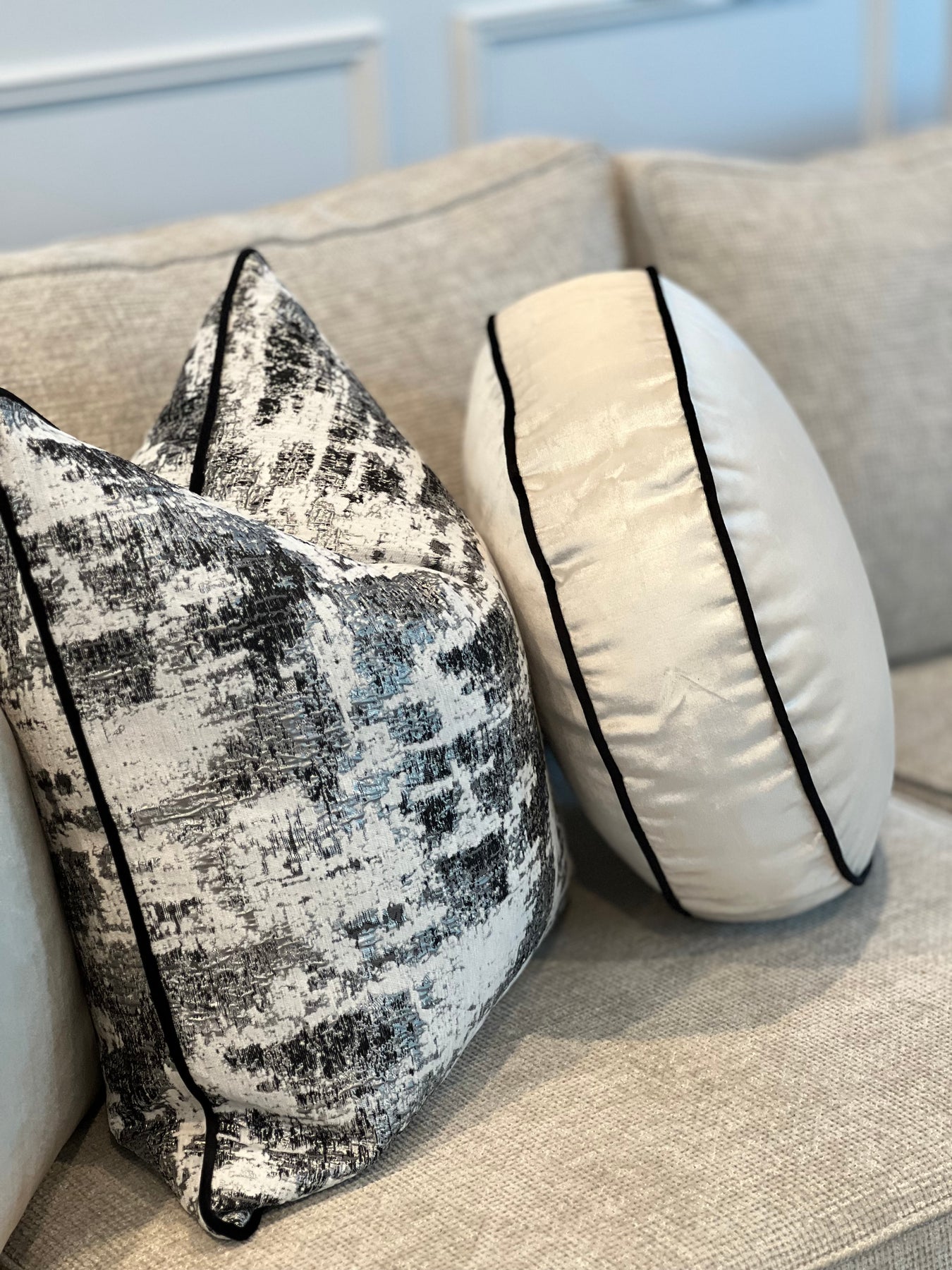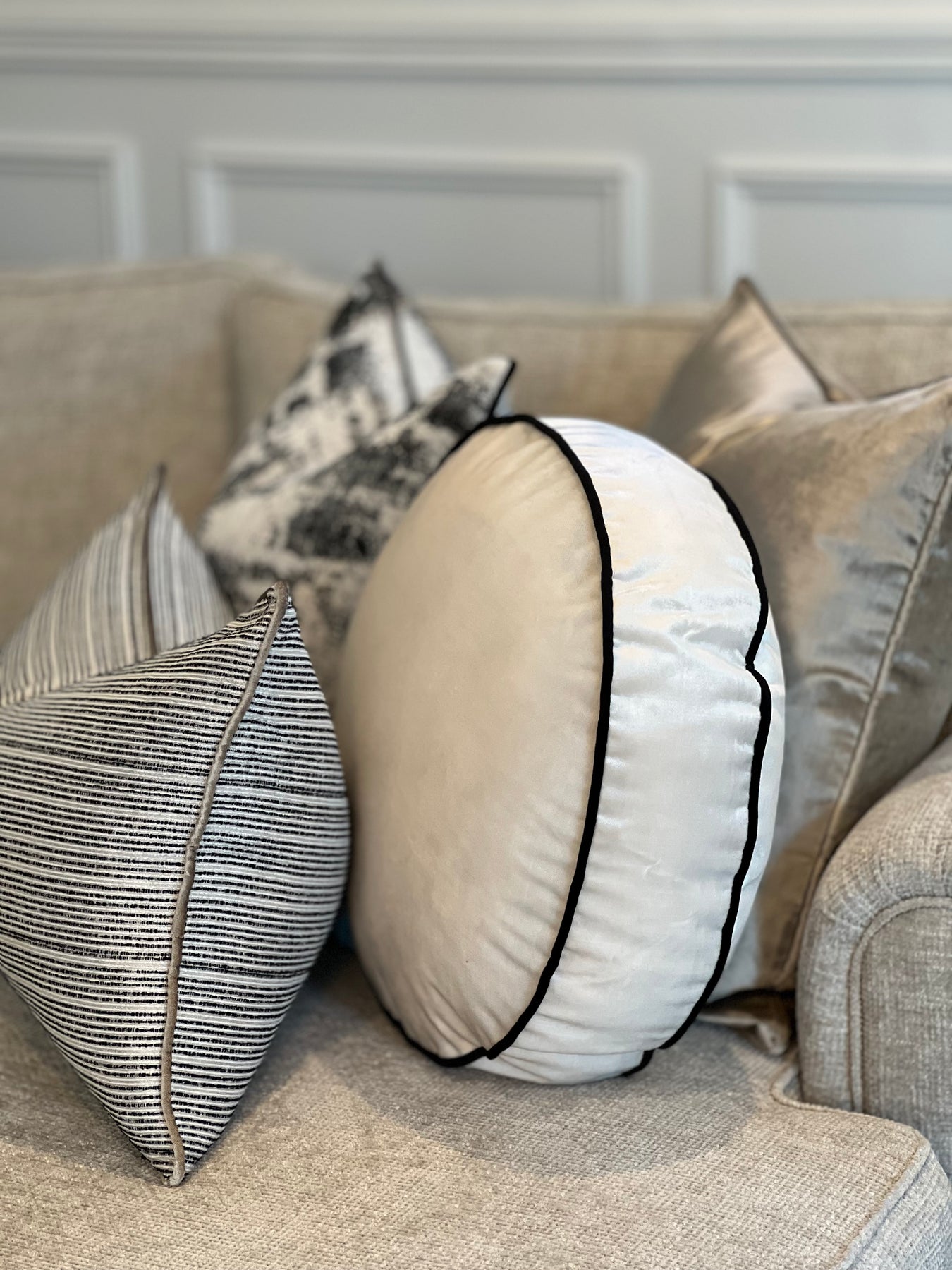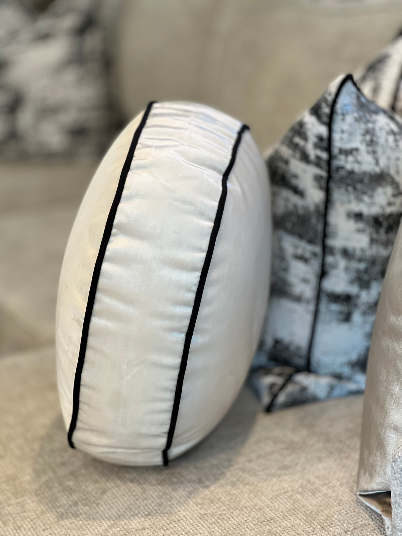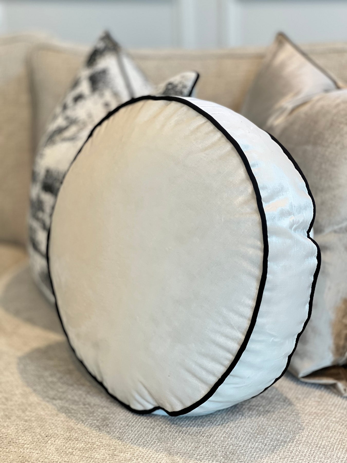 Royal luxe pearl white / black piping round cushion 50cm diameter