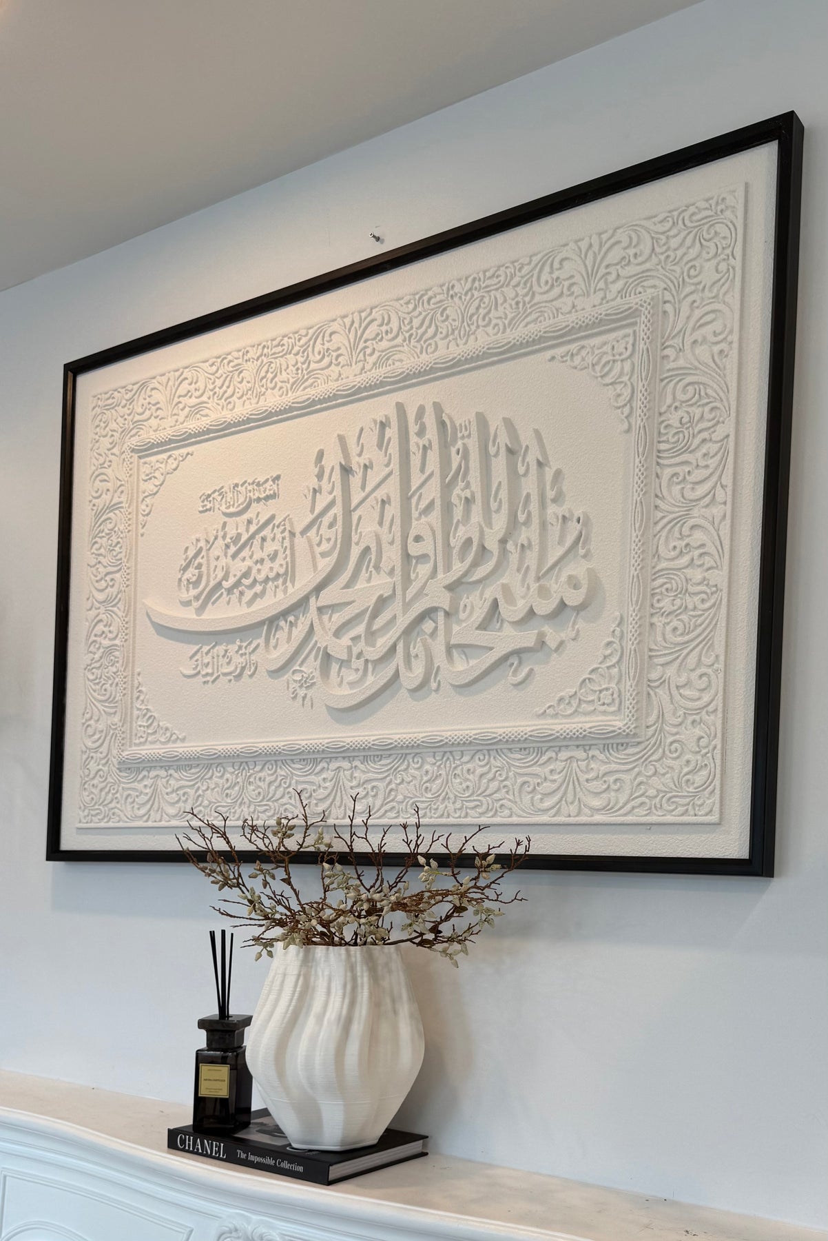 Stone effect calligraphy wall art black frame "Glorious You are O Allah, and with Your praise, and blessed is Your Name, and exalted is Your majesty, and none has the right to be worshipped but You."