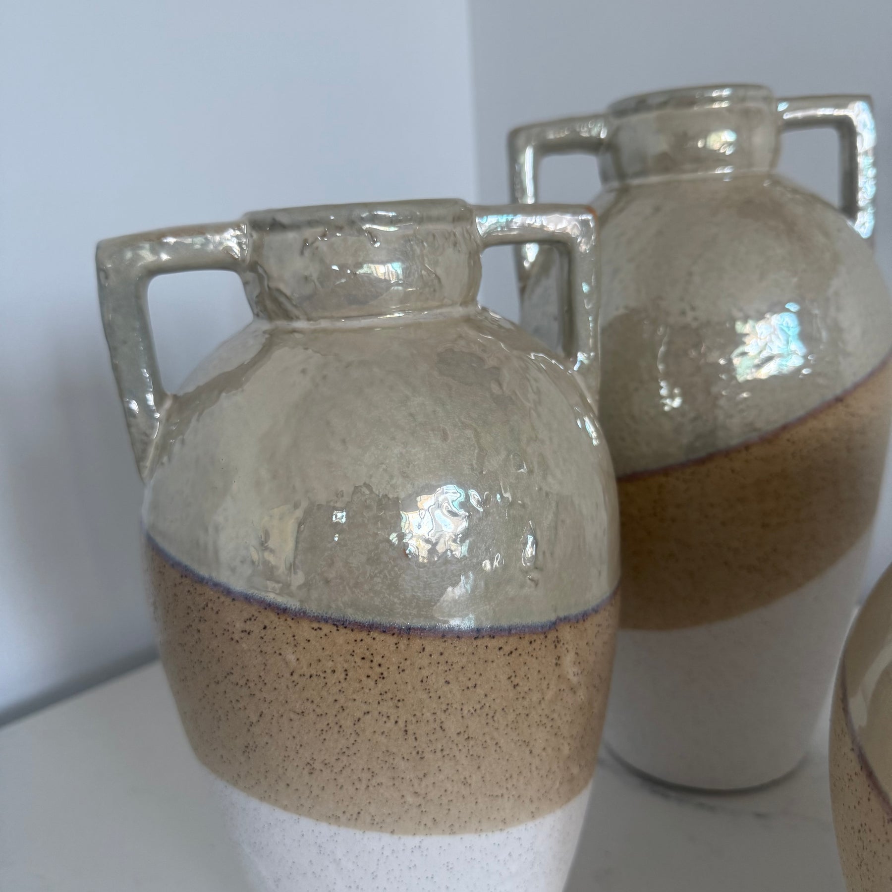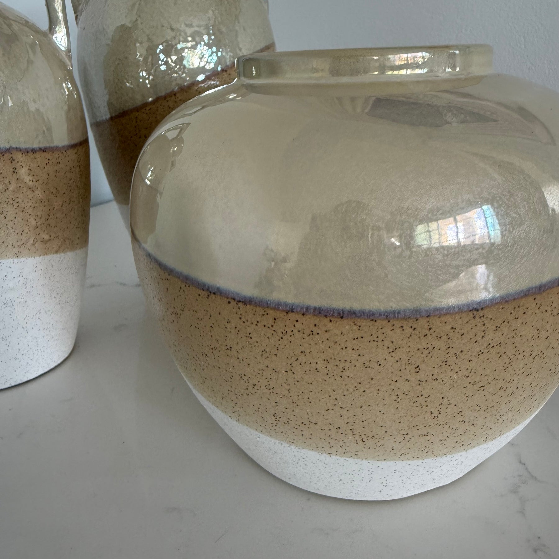 These are three handcrafted ceramic vases with a three toned, textured finish